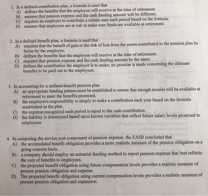 9 Docx In A Defined Benefit Plan A Formula Is Used That A B C D 26 Requires That The Benefit Of Gain Or The Risk Of Loss From The Assets Contributed Course Hero from www.coursehero.com Defined benefits use formulas by contrast, defined benefit plans work using predefined formulas. That's because the employer adjusts annual contributions, reflecting asset levels, such that retirement benefits are funded. We specialise in dealing with the retirement planning needs of global expatriates. Mehr als 200.000 maschinen sofort verfügbar. Retirement plans may be divided generally into two types: The plan is considered a defined benefit plan because the employer bears the investment risks and rewards and the mortality risk if the employee elects to receive benefits in the form of an annuity. This is generally a simple contribution to calculate and administer. An appropriate funding pattern must be established to insure that enough monies will be available at retirement to meet the benefits promised.